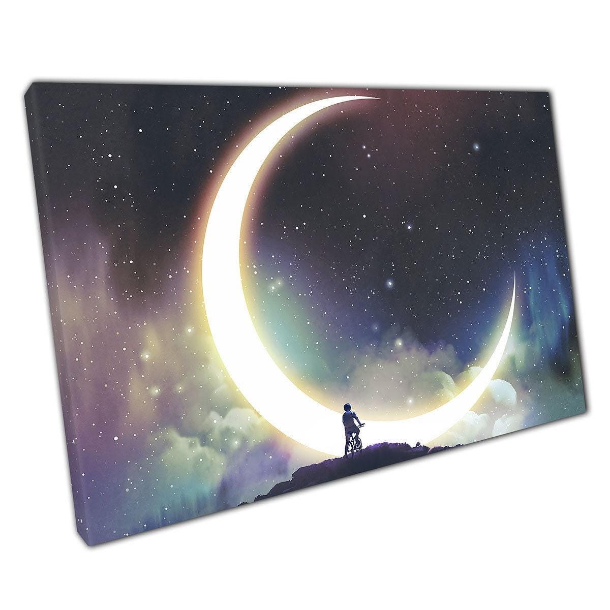 This enchanting canvas wall art depicts a young boy riding his bicycle, captivated by the breathtaking crescent moon set against a serene sky. This artwork is an ideal enhancement for your home or office, infusing any environment with a sense of wonder and tranquility.